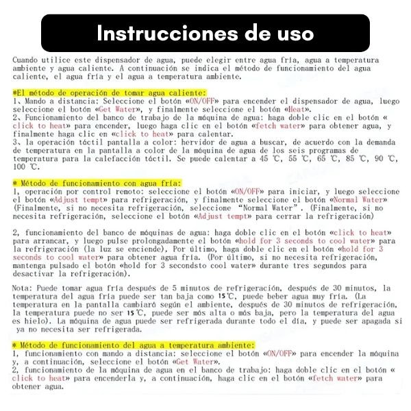 - ✅ Agua fría: 3°C – 5°C | Agua caliente: 85°C – 95°C