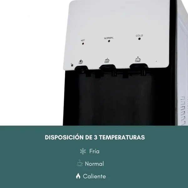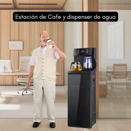 Dispenser de osmosis inversa de 5 etapas con compresor. Agua fría (3 °C–5 °C) o caliente (85 °C–95 °C) directamente desde la red. Ideal para hogares y oficinas.